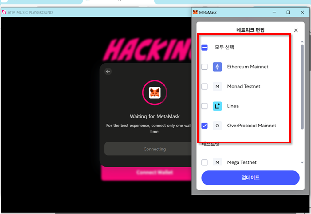 4. 메타 마스크 선택 후 반드시 "권한"을 클릭하여 네트워크 편집에서 Over만 남겨두셔야합니다!